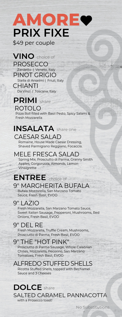 Dine In Reservations are recommended. The Amore menu will also be available for online order exclusively via www.raccaspizzeria.com! Our regular menu will also be available during these dates.